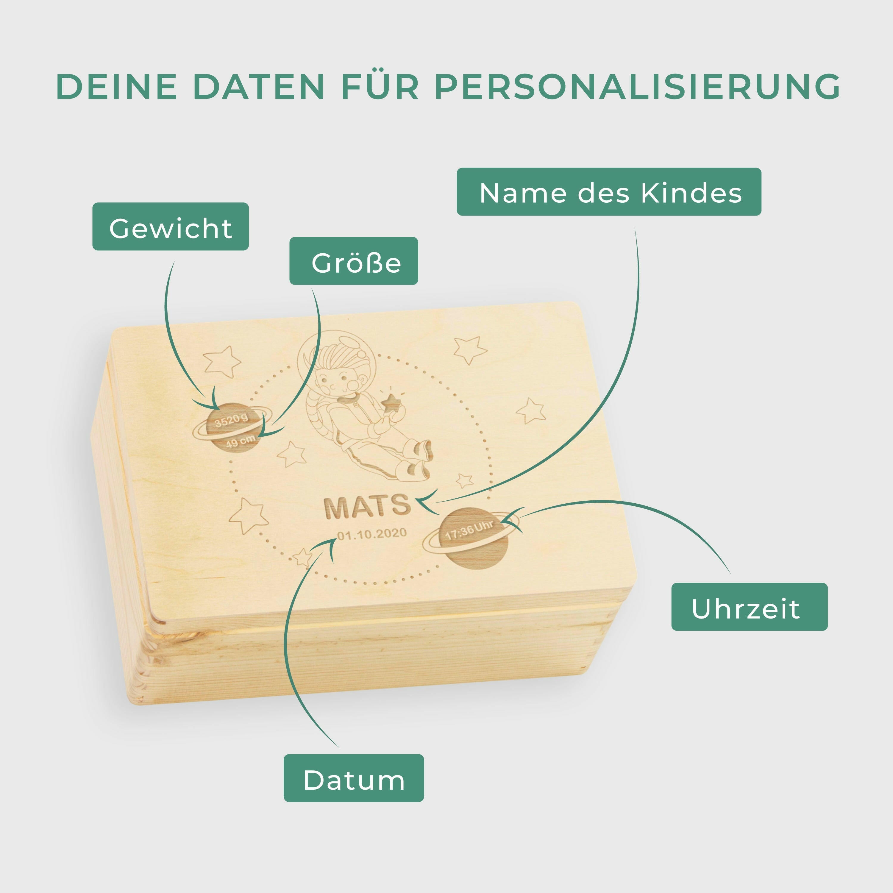 Wir gravieren dir die Holzkiste mit dem Namen deines Kindes oder Enkelkindes und individuellen Geburtsdaten wie Datum, Gewicht, Größe und Uhrzeit der Geburt. Dadurch entsteht ein ganz persönlicher Ort der Erinnerung, der auch noch nach Jahren und Jahrzehnten viel, viel Freude bereitet und für rührende Momente in der Familie sorgt.