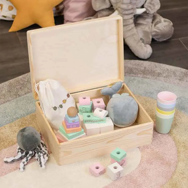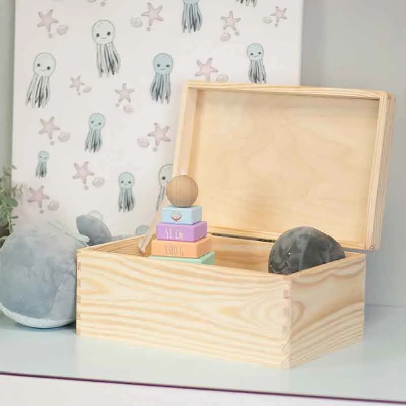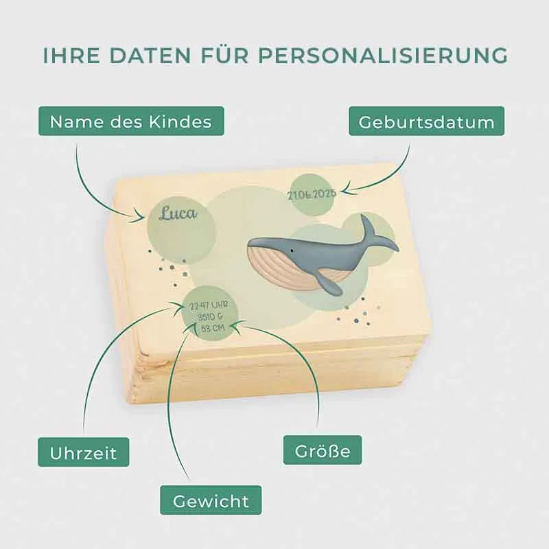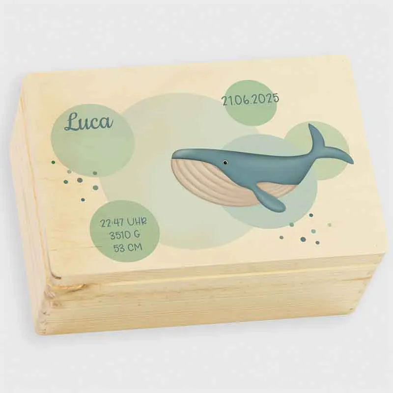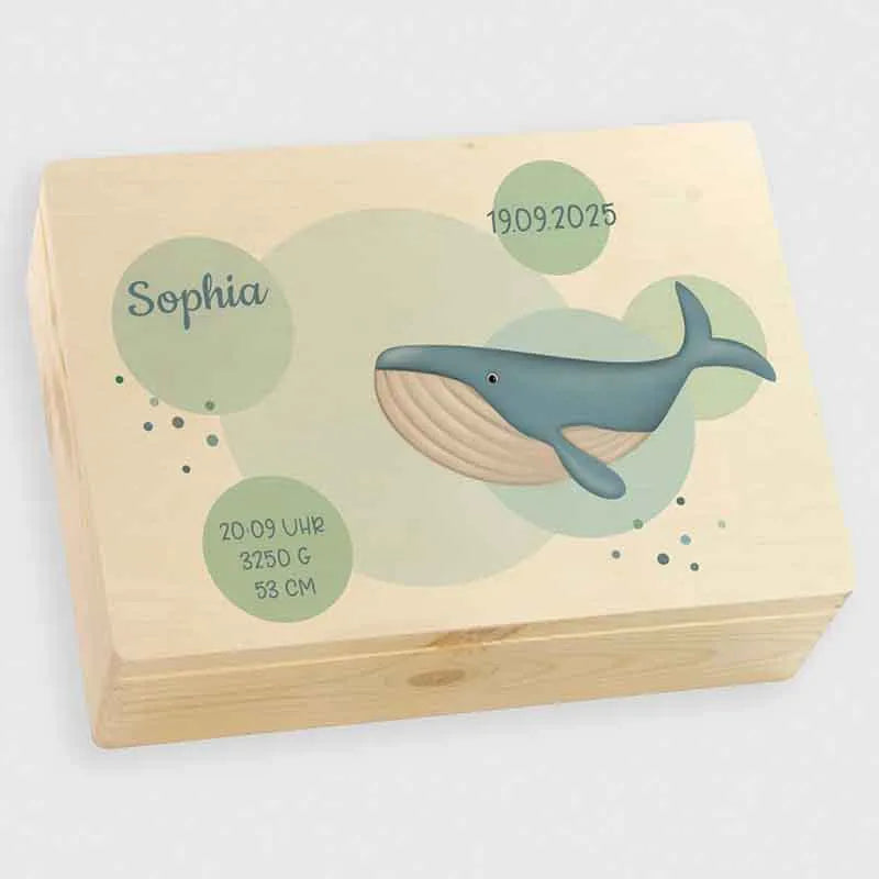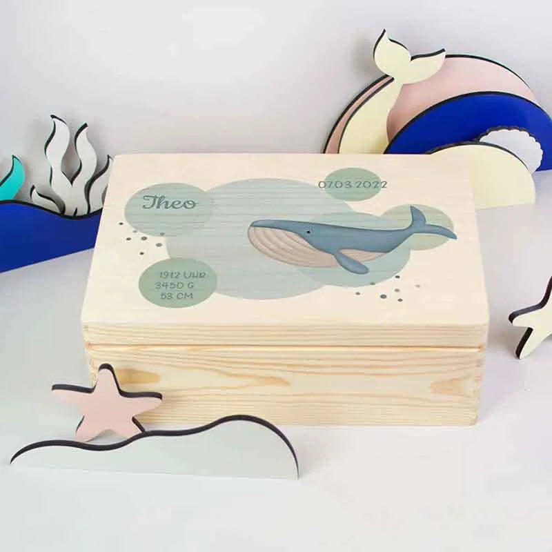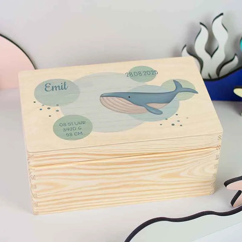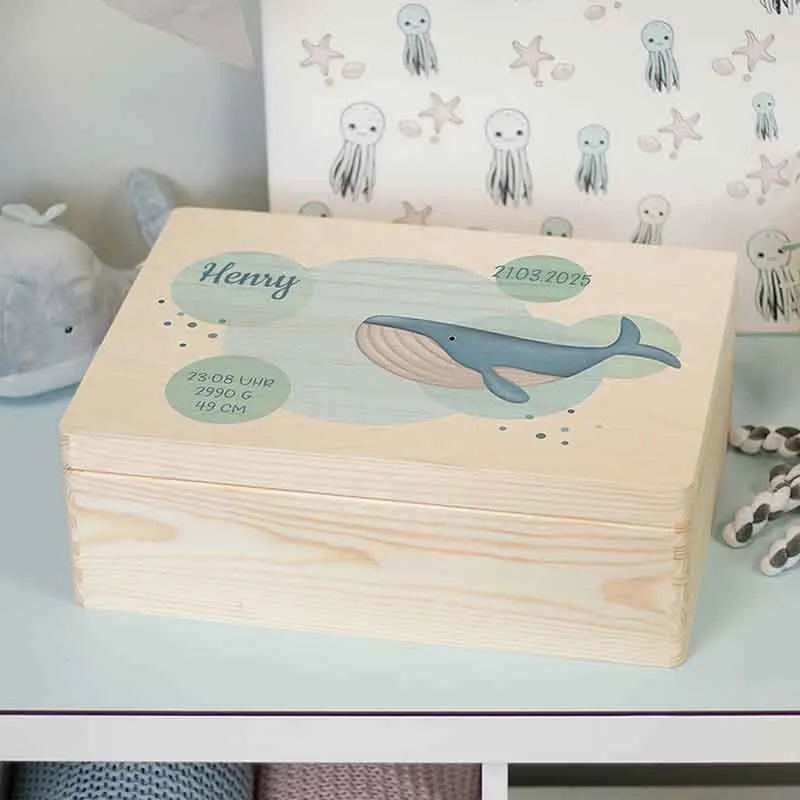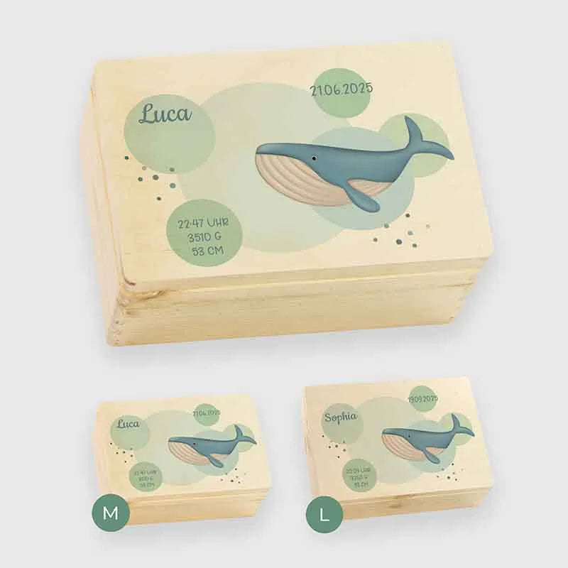 Erinnerungsbox für Baby - Wal & Ozean - Holzkiste zur Geburt - Natur, FSC® | Personalisierte Erinnerungskiste als Geschenk, Babykiste - M & L
