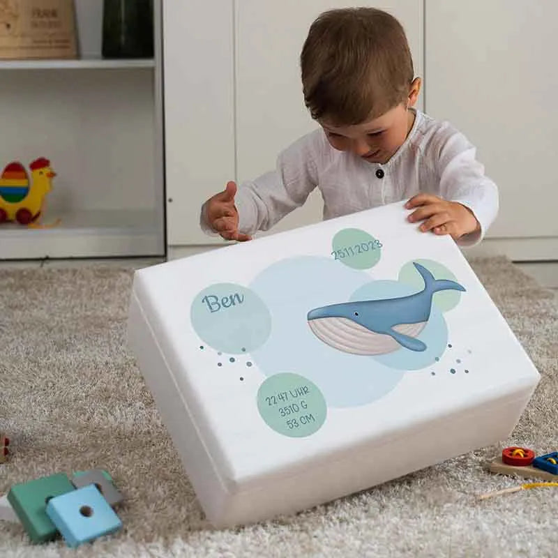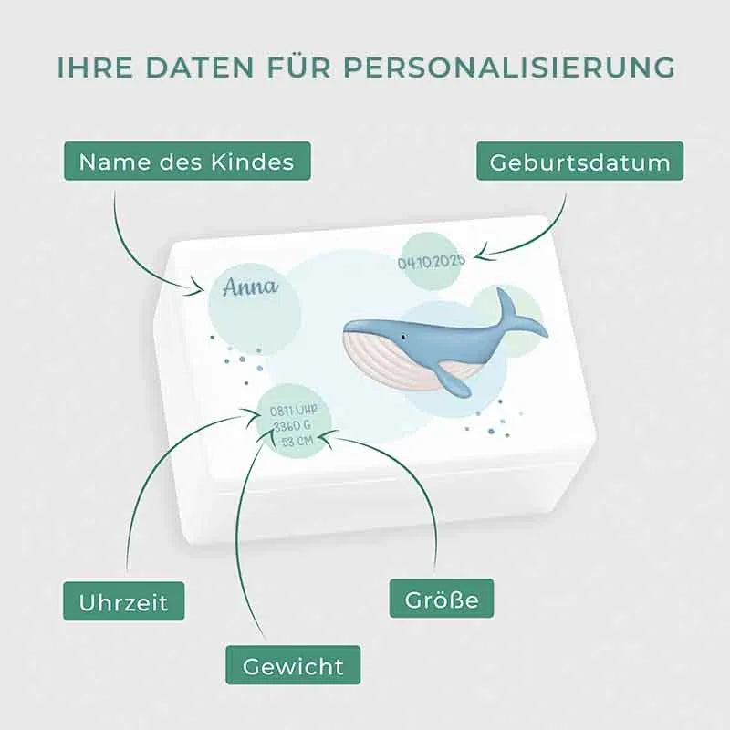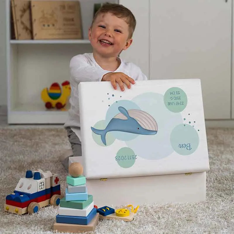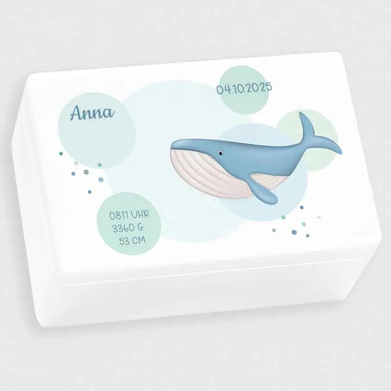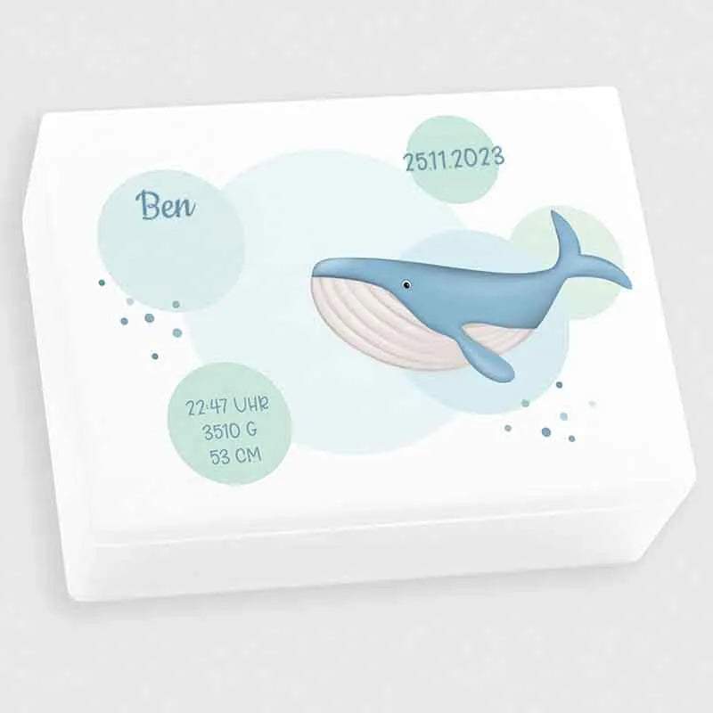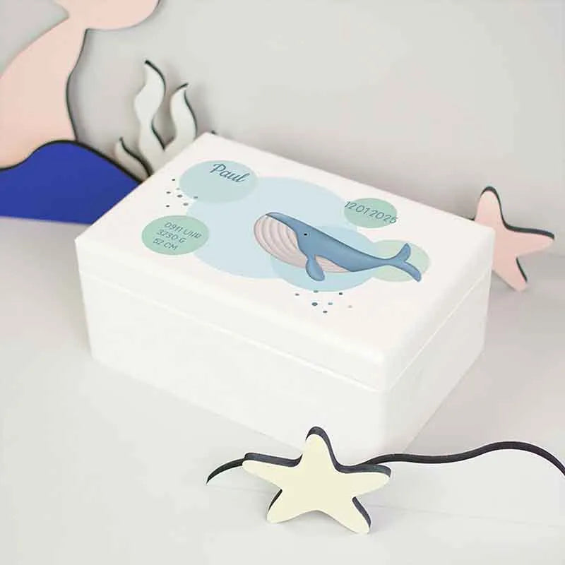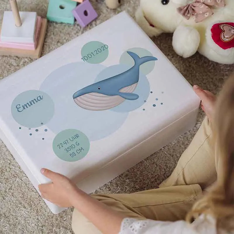 Erinnerungsbox für Baby - Wal & Ozean - Holzkiste zur Geburt - Weiß, FSC® | Personalisierte Erinnerungskiste als Geschenk, Babykiste - M & L