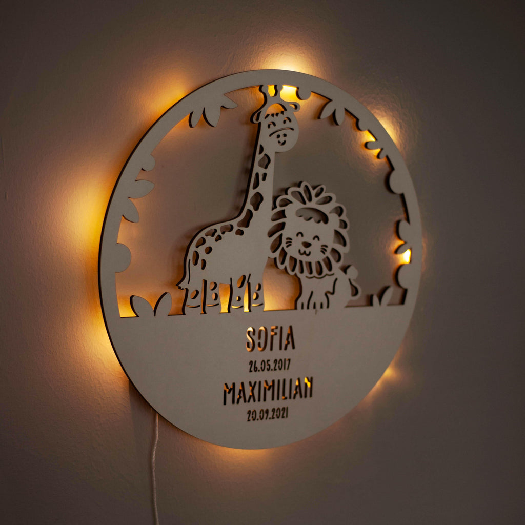 Schlummerlicht Baby mit Namen - Kinder Nachtlicht Personalisiert - Dschungel | LED Holz Lampe natur - Geschwister Geschenk