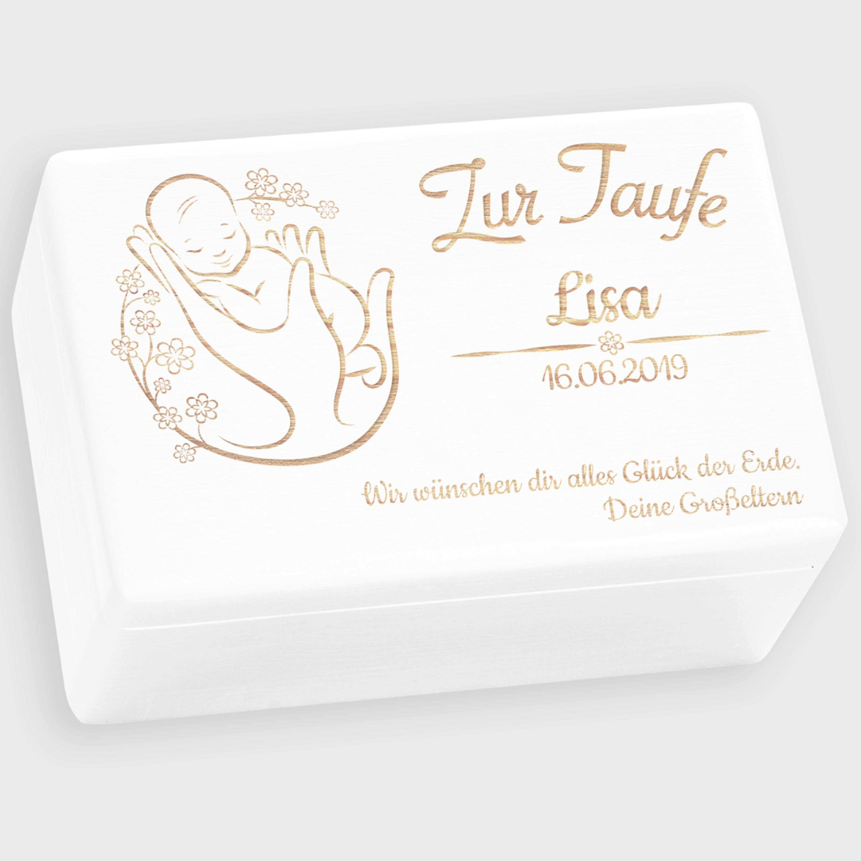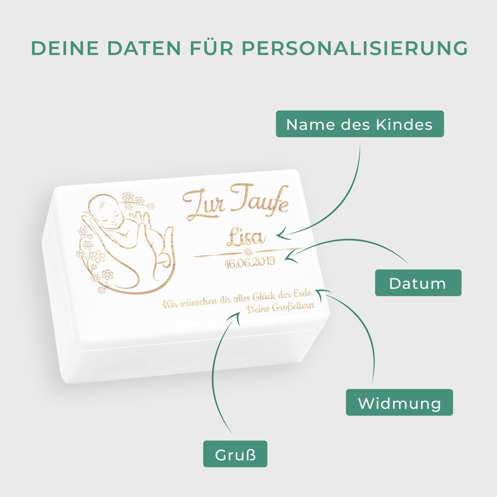 Personalisierte Erinnerungsbox als Taufgeschenk - Blumenbaby - Holzkiste, weiß, FSC® | Erinnerungskiste als Geschenk zur Taufe - Kiste aus Holz