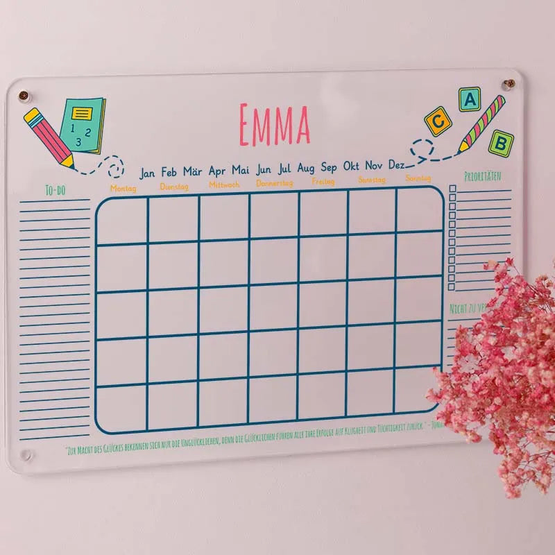 Personalisierter Wandkalender für Kinder - Schule Motiv | Wochenplaner & Monatsplaner mit Name - Acrylglas, abwischbar