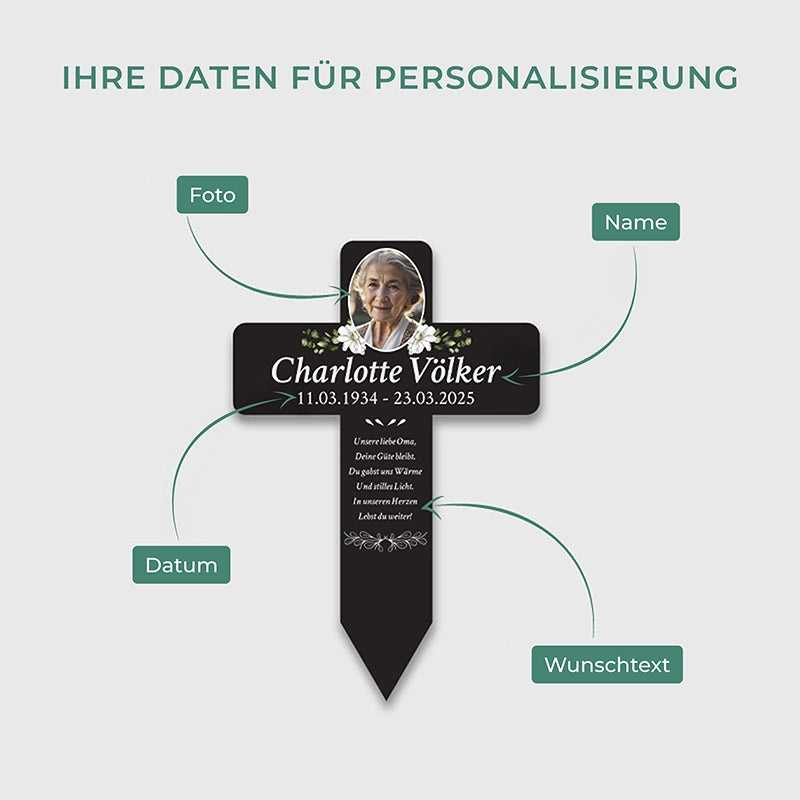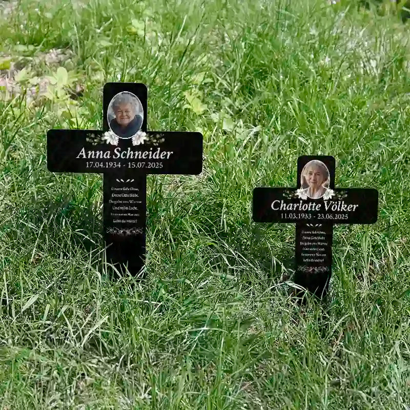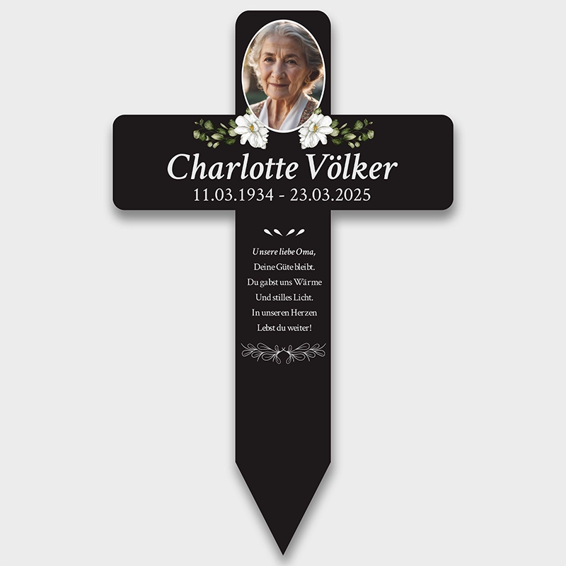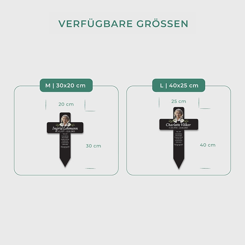 Personalisiertes Grabkreuz aus Acryl als Grabschmuck für Menschen mit Foto & Wunschtext - Blumen, 2 Größen | Grabstecker mit Gravur als Grab-Deko