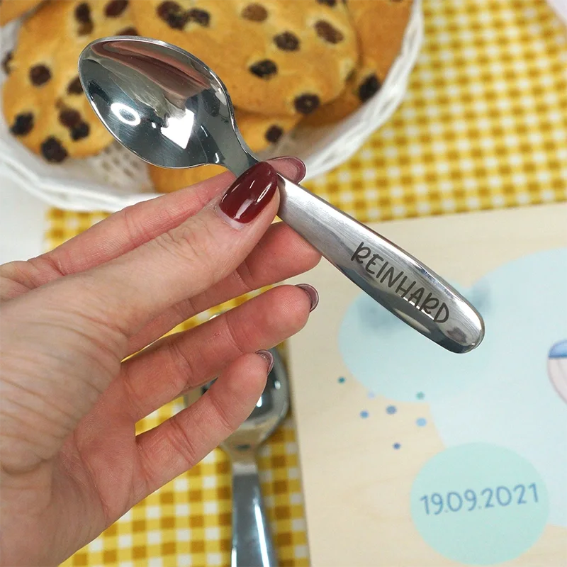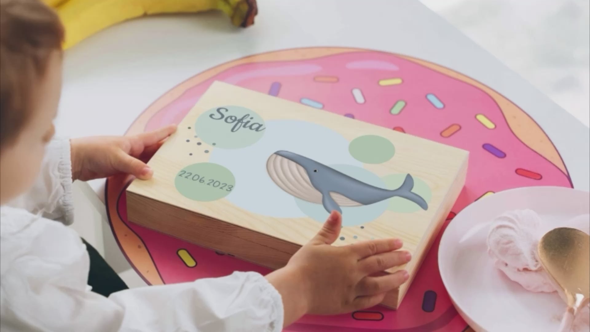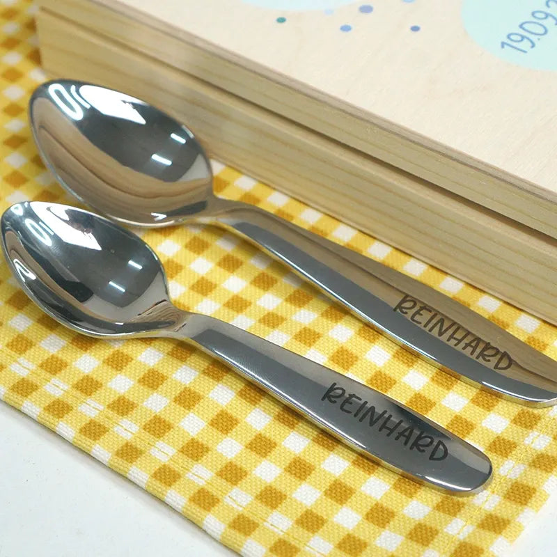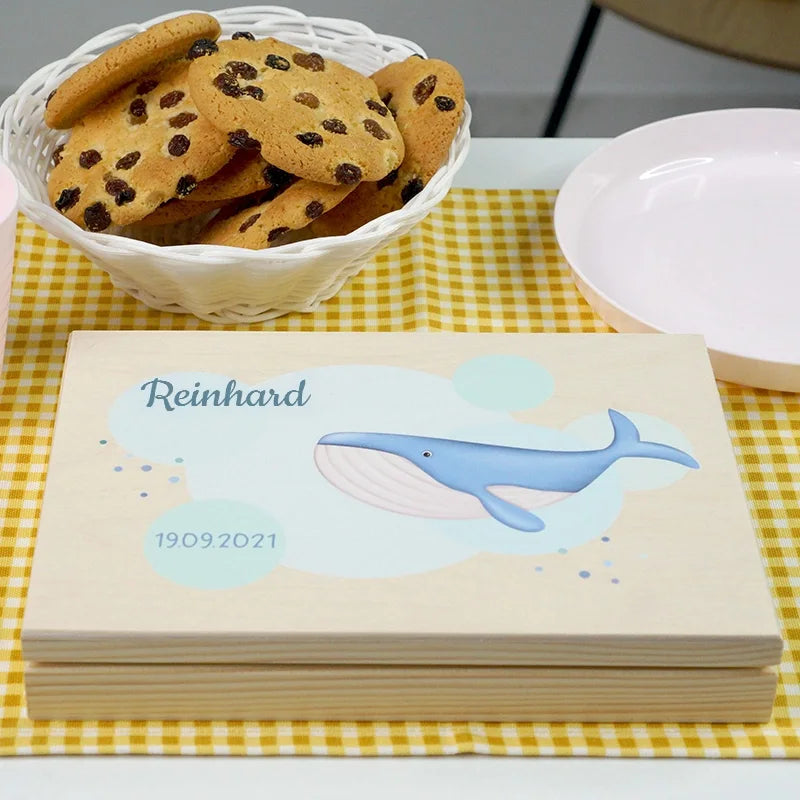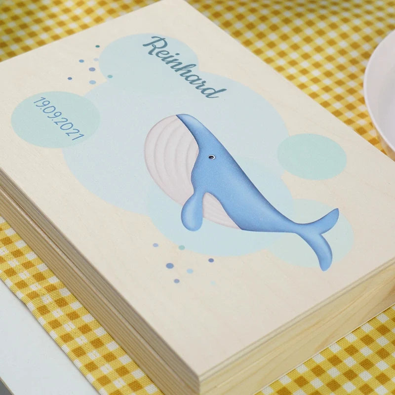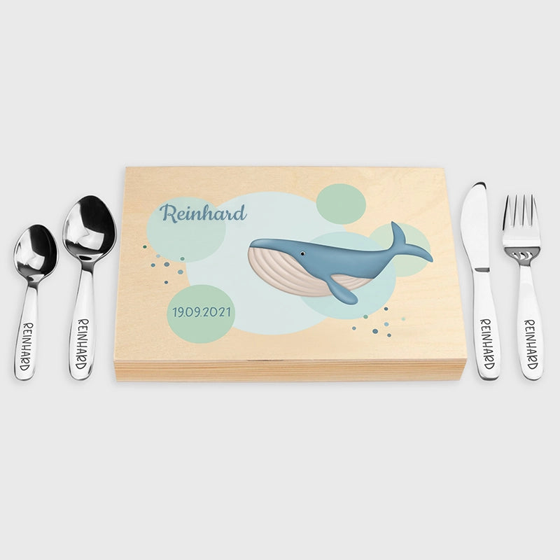 Kinderbesteck personalisiert mit Namen - Wal Motiv - Besteck mit Namen | Taufgeschenk für Kinder - Geschenk zur Taufe für Jungs & Mädchen, natur Kiste