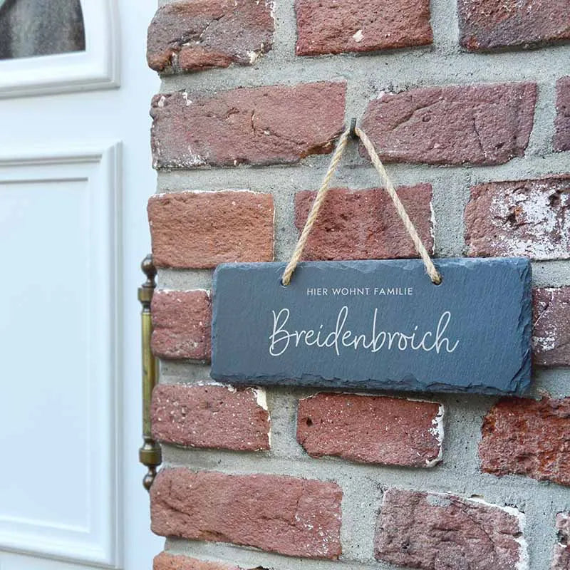 Begrüßen Sie Ihre Besucher an der Haustür mit einem individuellen Türschild aus Schiefer. Das Besondere an diesem Haustürschild ist, dass es mit zwei Wunschtexten ganz individuell personalisiert werden kann (z. B. mit den Namen Ihrer Familienmitglieder und dem Familiennamen). Mit einem so schönen Namensschild vermitteln Sie jedem Gast beim Eintreten sofort das Gefühl, herzlich willkommen zu sein.