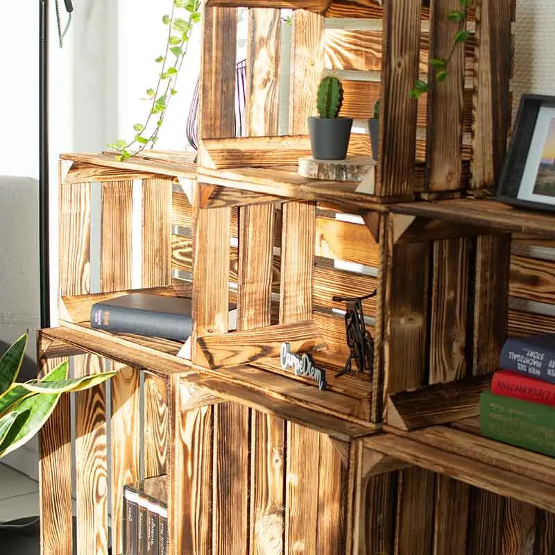 Mit dem 7er Set geflammter Weinkisten von LAUBLUST, das aus drei großen und vier kleinen Kisten besteht, können Sie Ihre Kreativität zu Hause voll ausleben. Bauen Sie sich ganz nach Belieben eigene Vintage oder Shabby Chic Möbelstücke, die sowohl nützlich als auch dekorativ sind. Wie wäre es zum Beispiel mit einem Weinkisten Regal, das Sie dann als Schuhregal, Bücherregal oder Weinregal für Ihre Weinflaschen verwenden können?