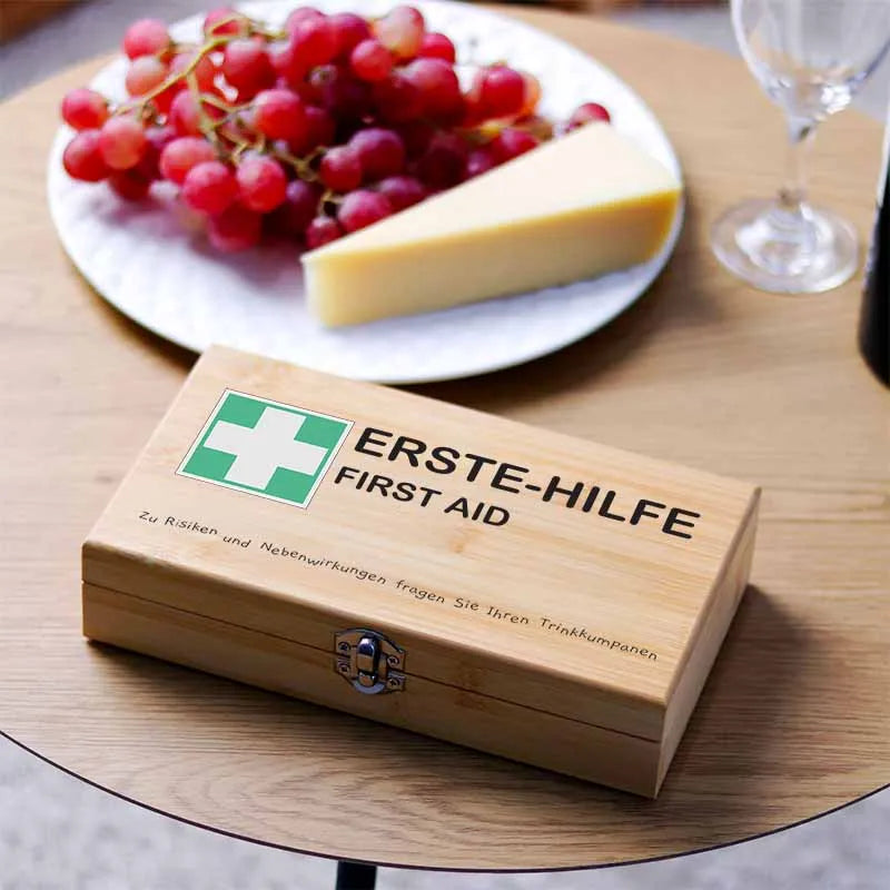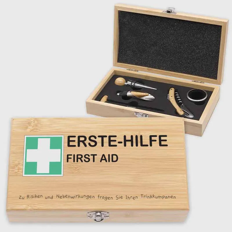 Weinöffner Set mit Geschenkbox aus Holz - Coole Geschenke für Freunde zum Geburtstag | Erste Hilfe - Weinzubehörset als lustiges Geschenk für Kollegen