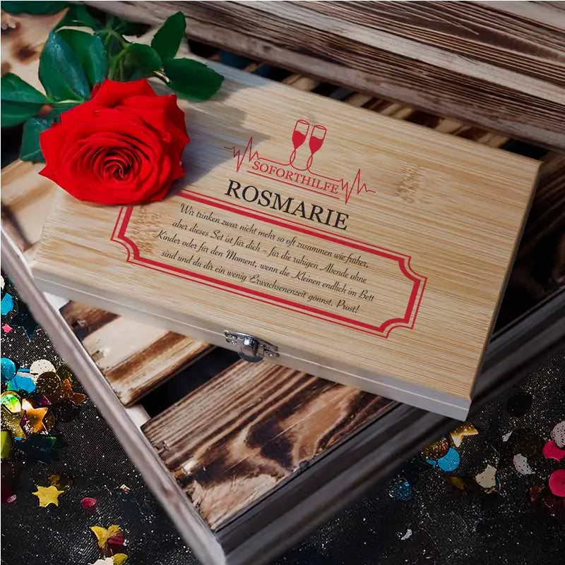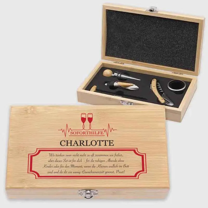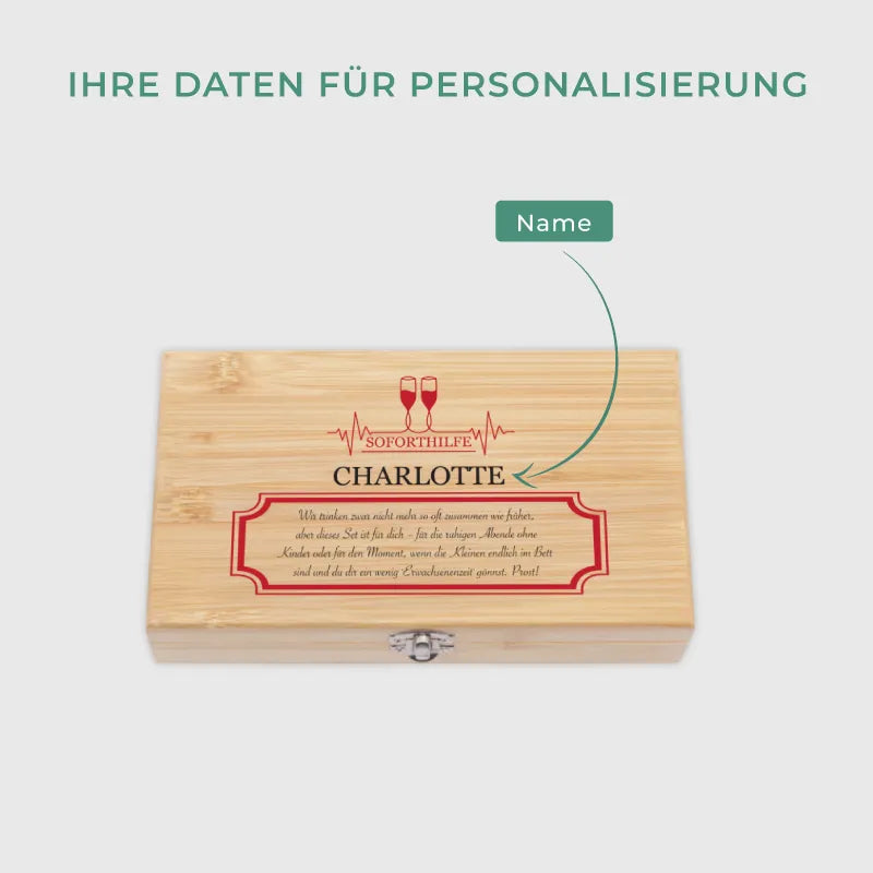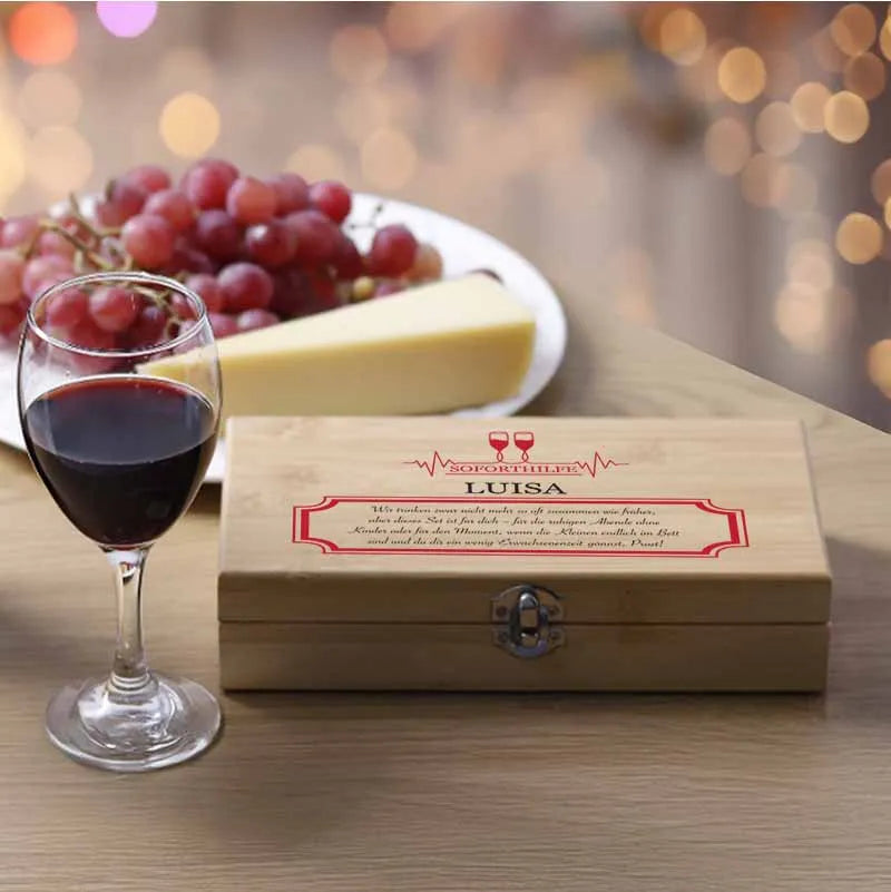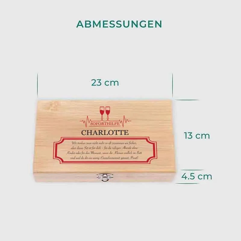 Das Weinöffner Set mit Name wird in einer Holz Geschenkbox im humorvollen "Soforthilfe" Motiv geliefert. Diese lustige personalisierte Box macht das Set zu einem einzigartigen Geschenk, das sich perfekt für Geburtstagsgeschenke, Jubiläen, Weihnachtsgeschenke und Valentinstagsgeschenke eignet. Das ist eine coole und kreative Geschenkidee für diejenigen, die dringend Erste-Wein-Hilfe brauchen. Ein personalisiertes Geschenk für Bestie, Freundin, Schwester, Bruder, Eltern, Ehemann oder Ehefrau!